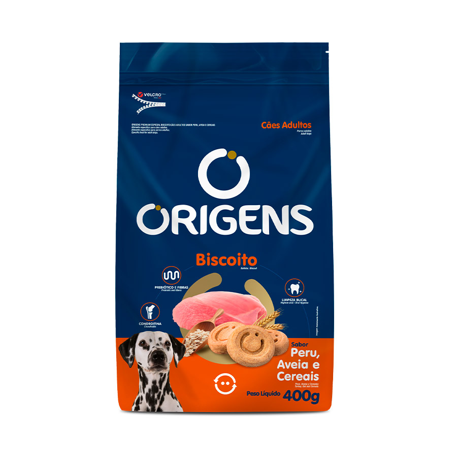 O Biscoito Origens Peru, Aveia e Cereais para Cães Adultos de 400g: É uma linha de alta qualidade para cães adultos. Indicado como recompensa e agrado, os biscoitos Origens oferecem Prébióticos e Fibras, Contém Condroitina e ajuda na limpeza bucal. É um petisco saudável e saboroso com ingredientes como Peru, Aveia e cereais.