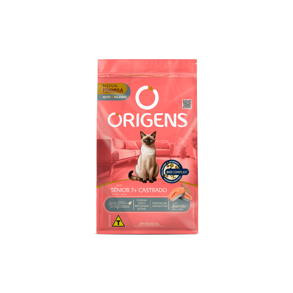 Ração Origens Sênior 7+ Gatos Castrados Salmão : Alimento completo para gatos adultos castrados sênior colabora para a Manutenção do Peso, ajuda a combate aos radicais livres, sem Corantes e aromatizantes artificiais