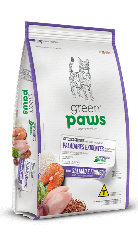 Ração Green Paws Gatos Castrados Paladares Exigentes Salmão e Frango: É um Alimento com uma formulação completa e especial para os gatos castrados de paladares exigentes. Esse irresistível alimento com o delicioso sabor de frango e carne. Cuidadosamente elaborado para satisfazer os gatos mais exigentes, com uma combinação exclusiva de prebióticos que reforçam a imunidade, antioxidantes que retardam o envelhecimento, vitaminas e minerais que proporcionam mais saúde, energia e vitalidade para seu pet.