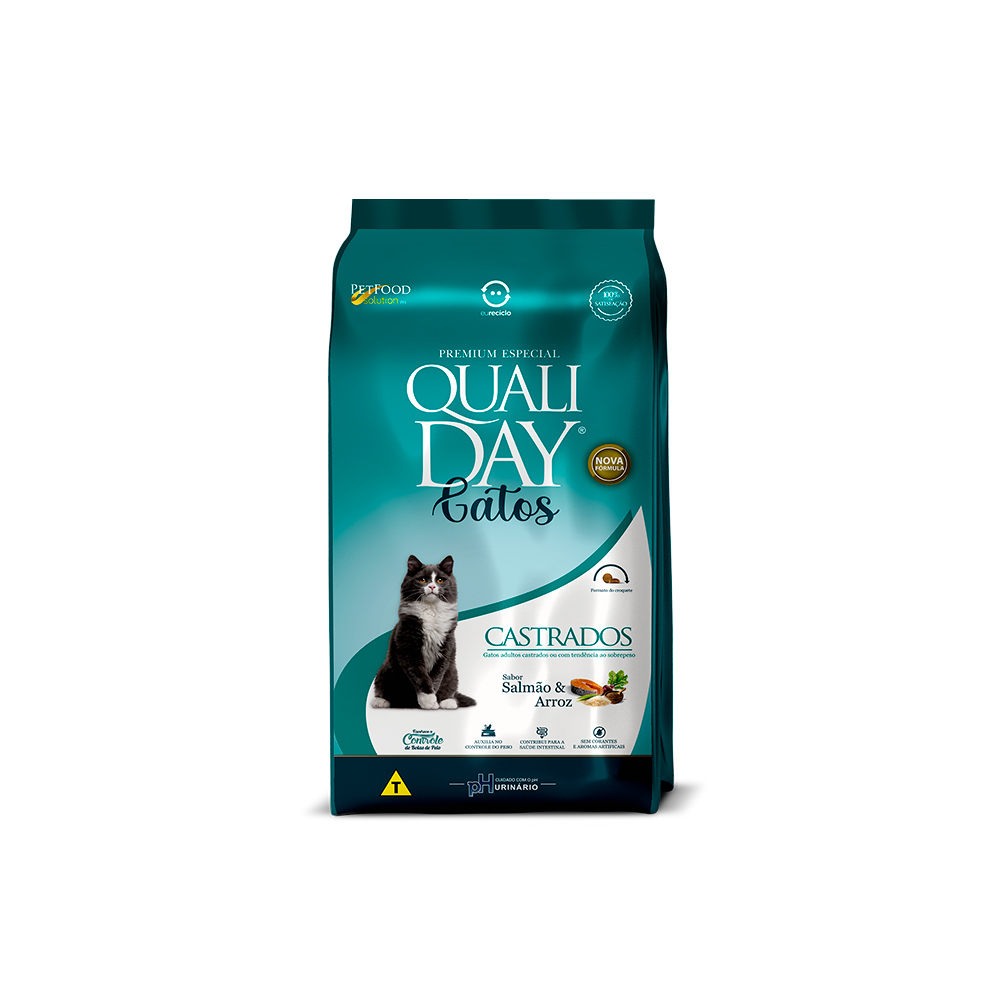 A Ração Qualiday para Gatos Castrados no Sabor de Salmão, Arroz e Vegetais é um alimento completo e balanceado indicado para gatos castrados. Após a castração é comum a obesidade, este alimento é ideal pois contém energia reduzida e L-carnitina, que auxilia na manutenção do peso ideal do gato. O alimento apresenta matérias primas de elevada digestibilidade e um equilíbrio perfeito entre os nutrientes, a ração contém mananoligossacarídeos (MOS) e probióticos, que contribuem no equilíbrio da flora intestinal, e o extrato de Yucca que ajuda a reduzir o volume e odor das fezes. É essencial a preocupação com a alimentação, a ração Qualiday contém taurina, um aminoácido essencial para a manutenção da saúde do gato, e ácidos graxos ômegas 3 e 6, que proporciona uma pelagem mais brilhante e macia ao animalzinho. Qualiday Cat ajuda na eliminação das bolas de pêlos e na redução do risco de cálculos urinários, devido a presença da polpa de ervilha e o psylium.