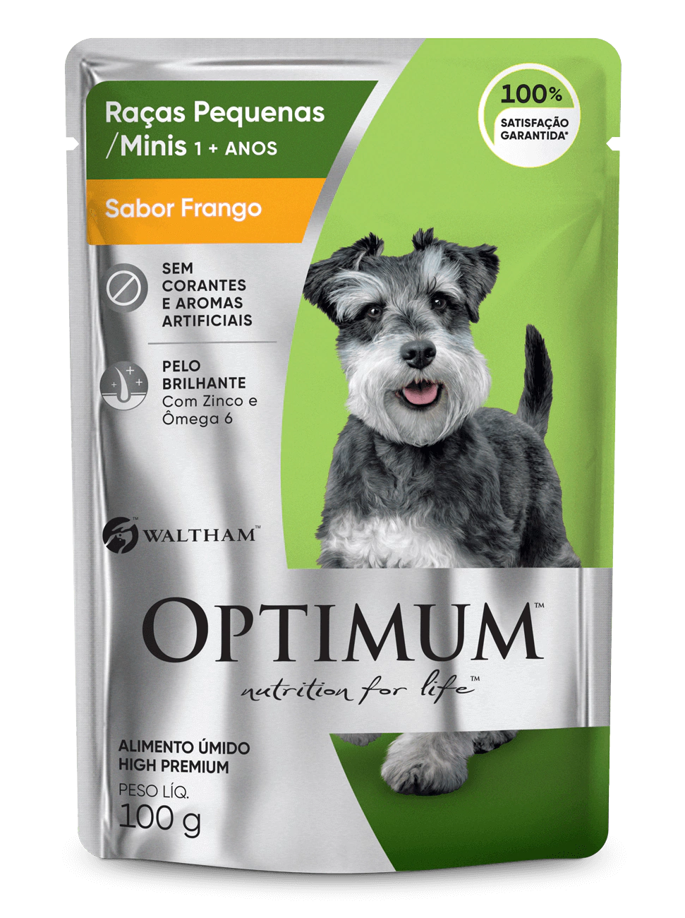 O Sachê Optimun Raças Pequenas e Minis Frango para Cães Adultos é completa pois possui todos os nutrientes que o cão precisa. Funcional pois garante parte do consumo de água diário, essencial para a saúde do animal. O que o cão consome em cada etapa de vida tem resultado direto em seu crescimento, força e bem-estar. Por isso OPTIMUM™ sachê foi desenvolvido usando as melhores matérias-primas, proteínas cuidadosamente selecionadas e nutrientes essenciais. Experimente misturar sachê com alimento seco. Pesquisas indicam que misturar alimentos úmidos e secos traz inúmeros benefícios à saúde do cão.
