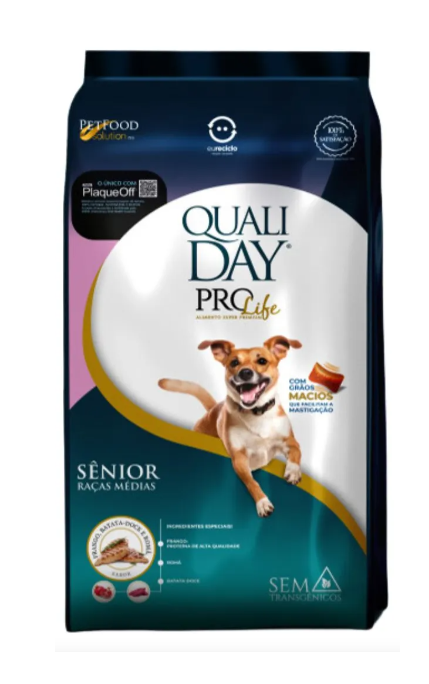 Ração Qualiday Pro Life Senior Raças Médias 13kg Frango, Batata-Doce e Romã : É um Alimento Completo para Cães Adulto acima de 6 anos, composição exclusiva com PlaqueOff®, componente extraído da costa da Escandinávia.