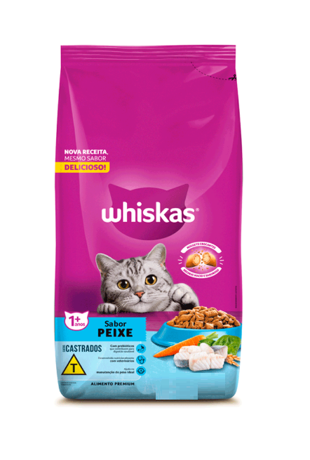 Ração Whiskas Gatos Adultos Castrados Peixe é nutricionalmente completa e balanceada, com um ótimo equilíbrio de vitaminas e minerais para ajudá-lo a fornecer os melhores cuidados para o seu gato adulto. A nova receita de Whiskas alimento seco combina a nutrição que seu gato precisa com o sabor que ele ama. Desenvolvida nutricionalmente com veterinários para ajudar a mantê-lo saudável e ronronando a vida toda.